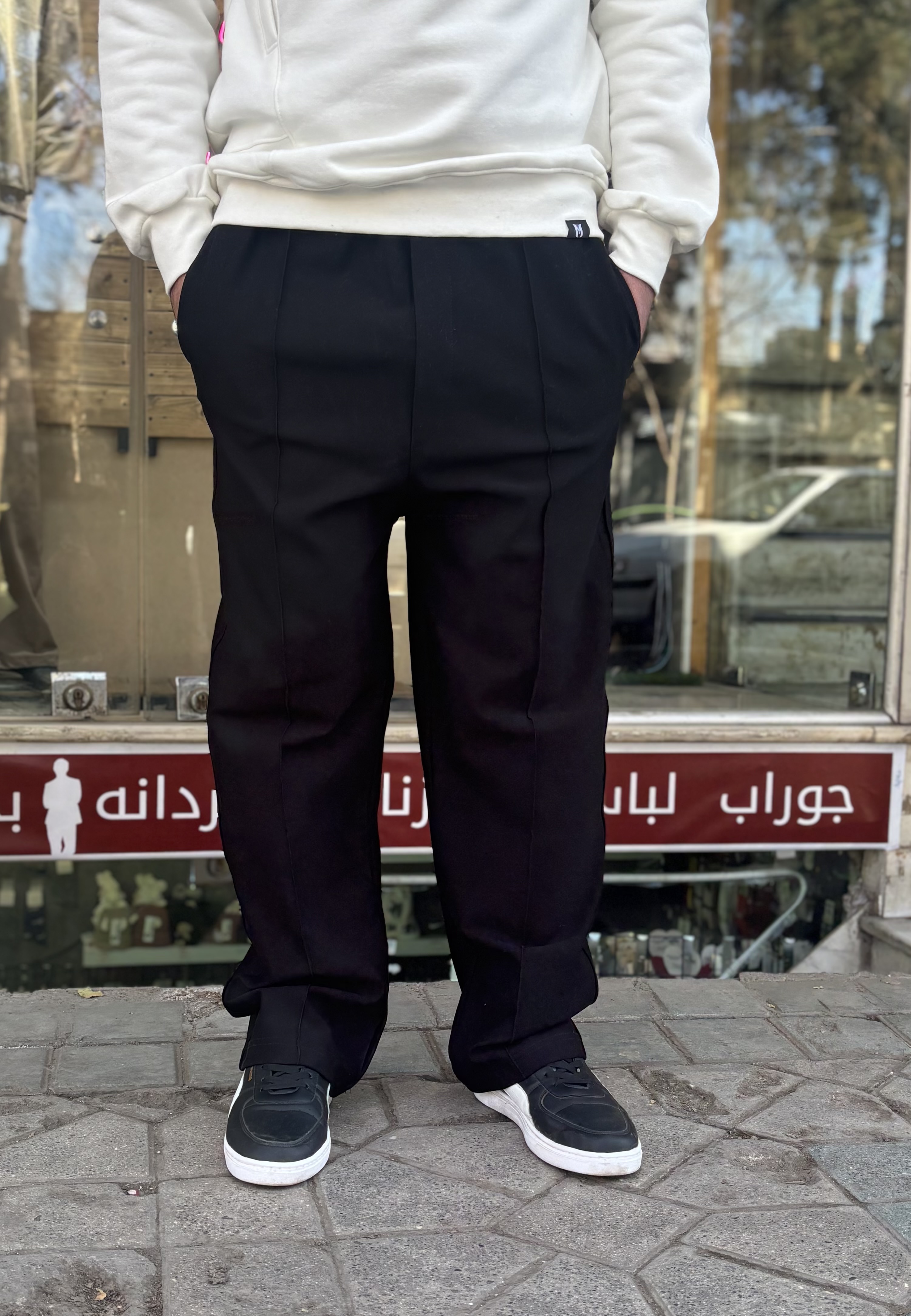 شلوار بگ پارچه گرم بالا بدون خز دوخت صنعتی مغزی دوزی شده کمر کش قابل تنظیم با بند مدل خط سفید از رنگ لباس استفاده شده